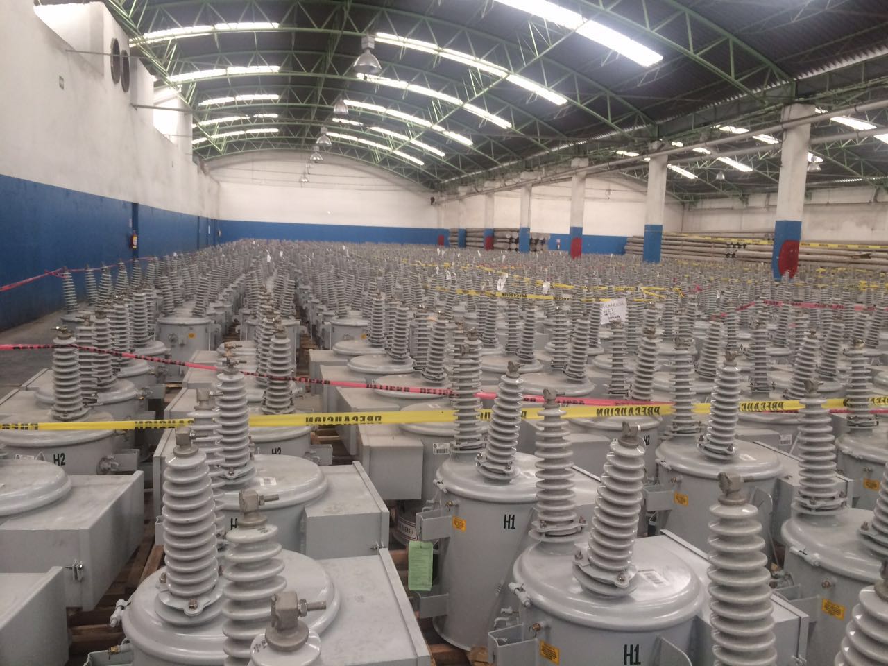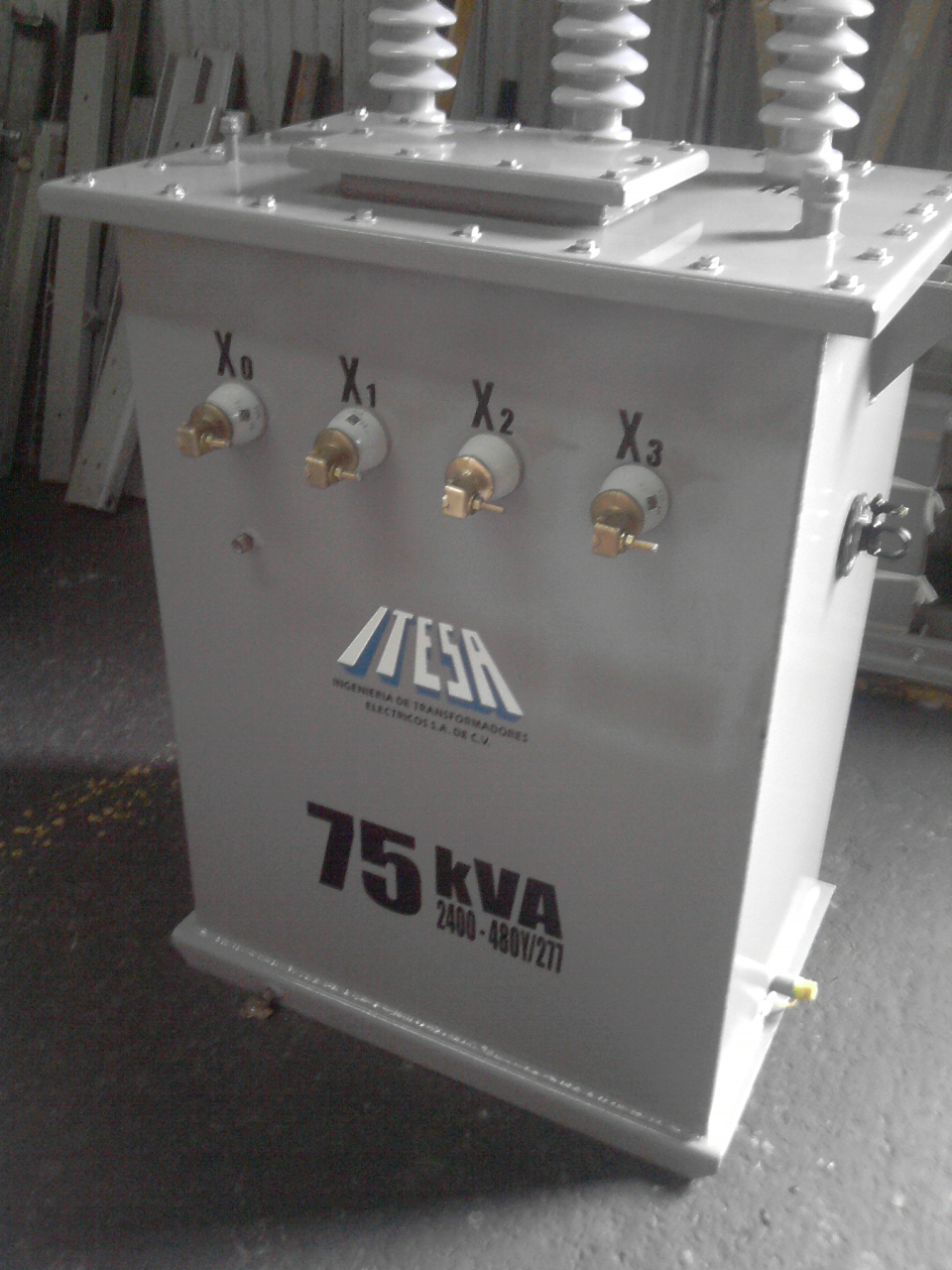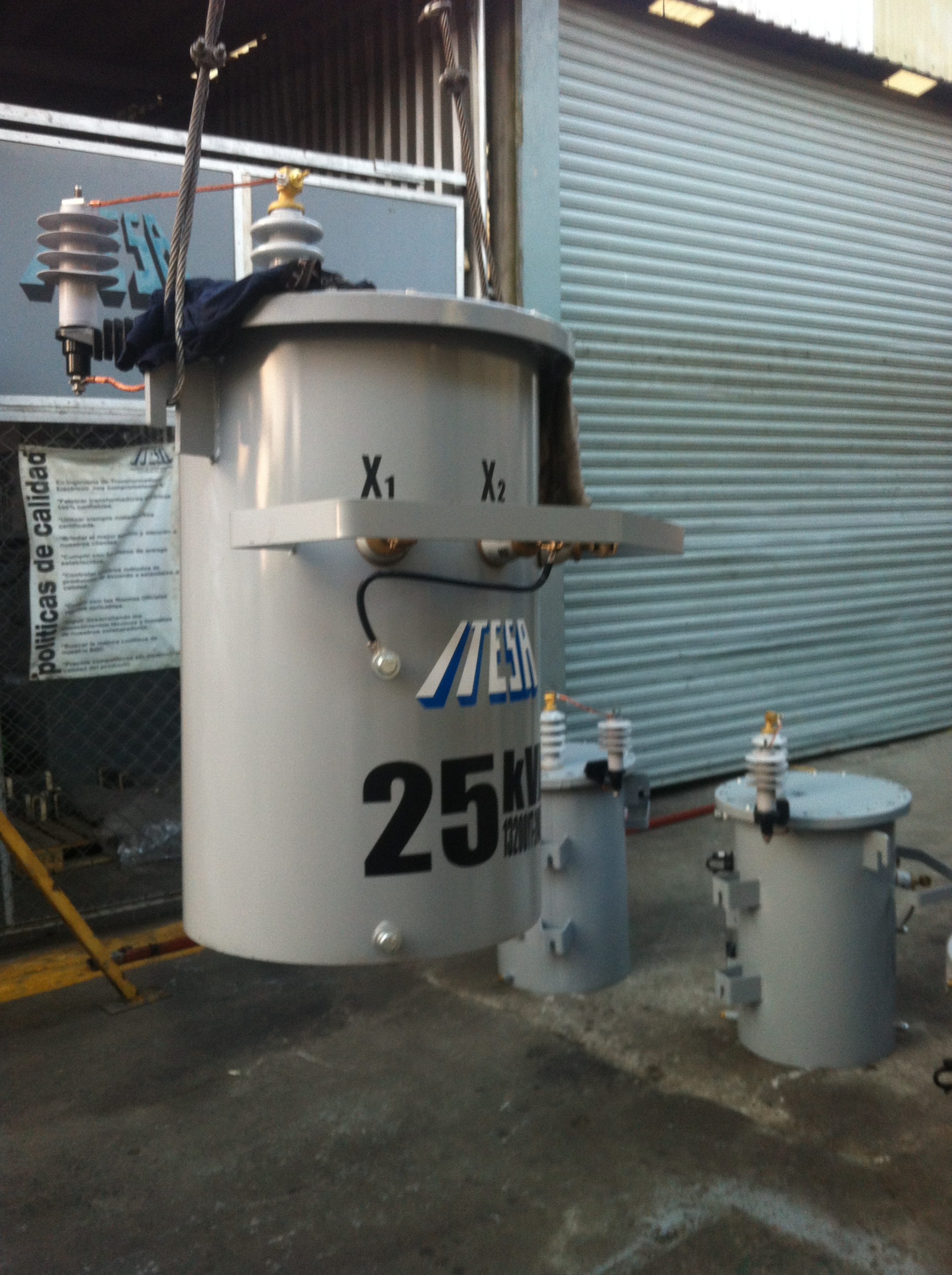 Tensiones del primario: 13,200 v., 23,000 v., 34,500 v., con cuatro derivaciones estándar de +2-2 X 2.5 % c/u de la tensión nominal, conexión delta.