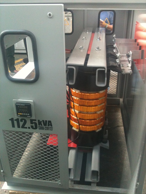 Tensiones del primario: 2,300v., 4,160v., 13,200v., 23,000., 34,500., con cuatro derivaciones estándar de +2-2 x 2.5 c/u de la tensión nominal, conexión delta/estrella.